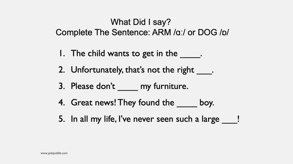 Play the audio recording and fill in the gap with an ARM /ɑː/ or DOG /ɒ/ word.